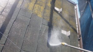 高圧洗浄機をあてると、みるみるうちに汚れが剥がれていき、もとの屋根材の色が見えてきました!