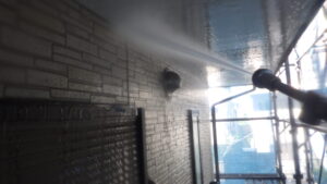 高圧洗浄とは、高圧の水流を使って屋根や外壁の汚れ・カビ・コケ・チョーキング(粉状の劣化)などを徹底的に洗い流す作業です。